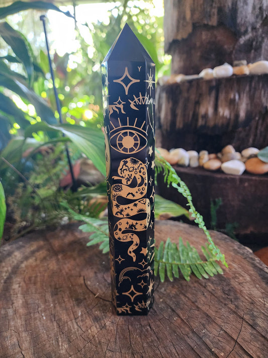 Large Black Obsidian Etched Celestrial Tower Point Engraved