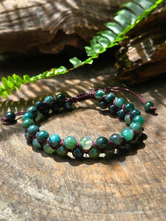 Moss Agate Crystal Bracelet – Adjustable 6mm Beaded Macrame